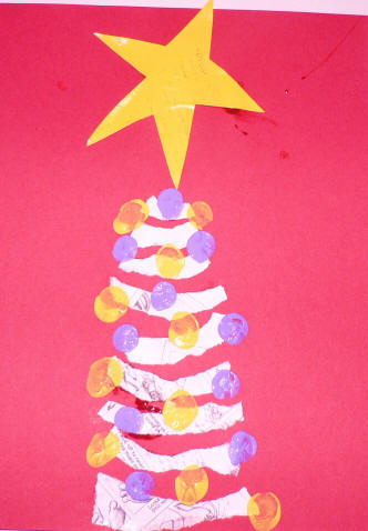 The neat Christmas tree is created using torn paper from a discarded book. Use a piece of construction paper as a backdrop. Tear the discarded paper. Use thumbprints smeared with paint to create the Christmas light bulbs.