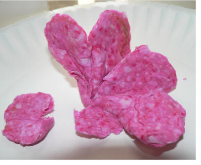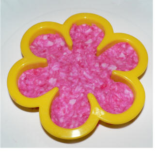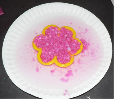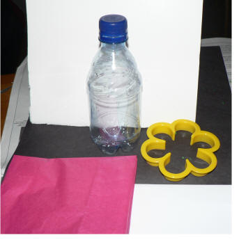 Tear into small pieces and place l sheet of white paper and l sheet of colored paper into a plastic water bottle. Pour warm water into the plastic bottle-about l/4 of the way up. Place the lid back on it. Now comes the fun part. Shake the bottle with your right hand about 100 times. Then shake 100 times with the left hand. Now finally one more time 100 times. You can create a dance. Make a fun time out of it. Now place the plastic cookie cutter into a paper plate and fill the cookie cutter with the paper mixture. Next, drain as much water as you can. Pat the paper mixture with a paper towel. Remove the cookie cutter and place the form onto the paper towel and then turn it over again. You can let it dry to form a small sheet of paper or form it into a shape while it is still damp.